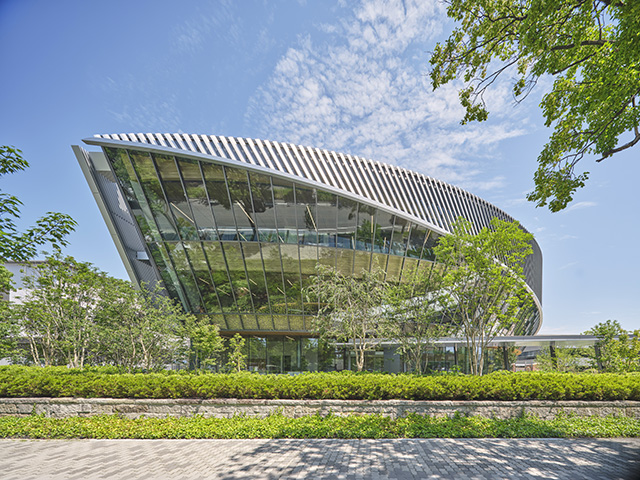 名古屋市に本社を置き、セラミック製品を製造、全世界で事業展開するメーカーの交流施設。「オープンイノベーションの推進」と「グループアイデンティティ浸透」を目的として建設され、環境効率の向上を図ったデザインや、エンボディドカーボン削減を意識した材料選定が行われている。計画では、熱田神宮から神宮東公園を経由する緑地帯との連続性に配慮がなされた。敷地内に緑を取込むため、施設は南東面を円弧にした、開かれた形態を持ち、アプローチ動線、円形広場のある前庭空間が、訪れる人を招き入れている。新堀川沿いの西に位置する敷地周辺は、大型施設が点在し、必ずしも市民になじみのある場所とは言えないが、道路を挟み、南側には名古屋市体育館がある。 現地には、良く晴れた平日の午前中に訪れた。日射遮蔽ルーバーが取り付けられた曲面のファサードと30°傾斜ガラスで構成された建物は、施設のボリュームを和らげている。アプローチの動線は、緑に沿って設けられ、庇の高さと幅を建物に向けて絞ることで、適度な緊張感を与えながら建物に導く。内部は回遊性を伴う吹抜け空間を介して、性格の異なるスペースが適所に配置されている。カーテンウォールの視線の抜け、日射と視線を巧みに制御した傾斜アルミルーバーの意図を体感することができた。吹き抜けを含むオープンスペースは、見付け18㎜のオーク材による天井ルーバーが全面取り付けられ、同じ見付け18mmのオーク材を積層にした壁面と一体化し、柔らかさと繊細さを感じさせる。また、北側と西側のフロアレベルに差をつけ、スキップフロアの構成にするなど細やかな配慮も見られた。 あえて気になったところをあげれば、外観のディテールであろうか。近づいた時に見えてくる、陰影、質感、仕組みなどをもう少し期待していた。また、業務関係者だけではなく、地域との交流があるとさらに良かったと思う。 (森 哲哉) |