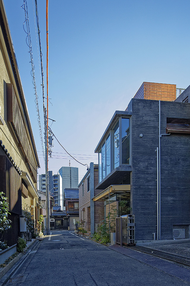 魅力が静かに詰め込まれた建物、これが訪れた際の第一印象である。熟達した設計者と発想豊かな施主の協働により、空間の器から細部の表現、さらにはプログラムに至るまで、多層的に語りかけてくる建物である。那古野地区は名古屋でも歴史的町並みが残る数少ないエリアであり、設計者は木造住宅密集地の延焼リスクに向き合い、ロ準耐火建築物1号として設計を展開した。長手方向のRC外壁を防火帯とし、顔料を混入して墨色とすることで、外部では町並みに溶け込み、内部では落ち着きと重量感を醸し出している。性能を確保しつつ空間的魅力を高める設計姿勢には妥協がなく、その細やかさは枚挙にいとまがない。内部にはヒノキ無垢材による木造架構が組み込まれ、黒皮鉄、スギ板型枠のリブ陰影、煉瓦、木材のサンダー仕上げなど、多彩な素材表現が重なり合う。人の手の痕跡と温度が空間全体に滲み出し、防火・構造・意匠が高次元で融合したこの建築は、歴史ある町並みに調和しつつ、秀逸な発想に基づく作品である。