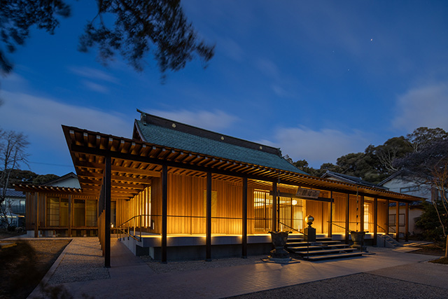 | 熊本地震を契機に建て替えが検討された龍泉寺本堂は、現代の社会と環境に開かれた建築として再構築された。かつて徳川家康が立ち寄ったとされる由緒ある寺であり、単なる再建ではなく、伝統と現代・未来を架橋する試みである。旧本堂は曹洞宗客殿式本堂の形式で、中央に安置されたご本尊とそれを囲む柱列で構成されていた。本計画では、ご本尊を上部に浮かぶように安置することで、座禅や法要、地域の集いが共存する開かれた場として、寺院建築の公共性を再定義している。この無柱の広がりを可能にしているのが、建物の名にも通じる「龍骨」である。樹齢220年を越える天竜杉による主要構造は、力学的合理性を超えて、天と地を架け渡す象徴的な存在として空間を支えており、その構造は、仏と衆生を結ぶ架け橋としての信仰的意味をも帯びているようである。寺院建築において屋根は、単に空間を覆うものではなく、天と地を媒介する思想的架構である。龍泉寺本堂の屋根は、伝統的な権威の象徴としての大屋根を継承しつつも、その造形をより根源的な機能、すなわち光と風を受け止め、自然を内部に呼び込む装置として再定義している。光は時間の推移を映し出し、風は空間を循環させる。そこに生まれるのは、内と外のあわいのような、自然と建築が交感する広がりである。本堂の大屋根は、それらの宗教的象徴を超えて、空間と人を包む存在となっている。光の移ろいや風の流れが空間に時間性を与え、自然の循環が建築の内側で可視化される。龍泉寺本堂は、伝統の形式を超え、環境と共に生きる新たな寺院建築の可能性を示している。 (金子 尚志) |