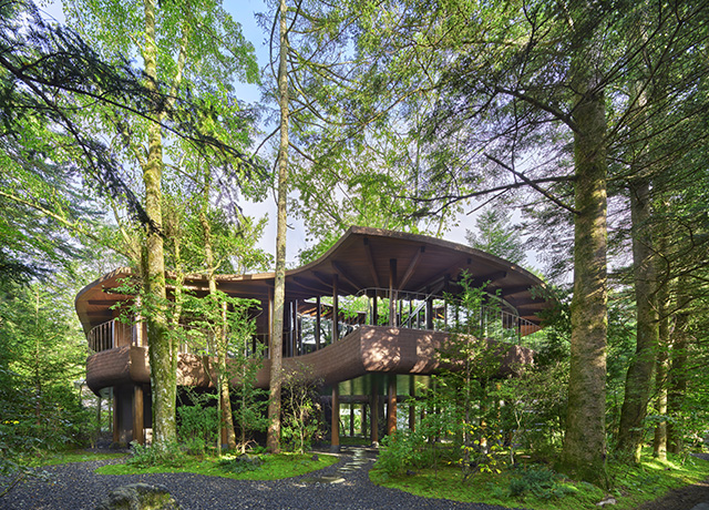 | Grave Strolling Corridorは、軽井沢の森に包摂されるように建つ住宅である。既存建物の配置を踏襲し、掘削量を抑えることで敷地と環境への負荷を最小限にとどめている。敷地内の樹木はすべて測量され、その位置を避けて計画されており、一本の伐採も行っていない。長い時間をかけてこの土地とともに生きてきた樹々に敬意を払うように建て替えられた様子は、後から環境に参加する建築が、環境の一部となって再び呼吸をはじめたかのようである。あらゆる部分にデザインの意思を込めるように設計の密度は高い。既存樹木との関係を丁寧に読み解きながら設けられたテラスや外壁周囲の「半屋内外空間」が、この敷地がもつ潜在的な力を引き出している。内外の境界が柔らかくつながることで、居住空間は軽井沢の空気をまとい、時間とともに変化する光や風が生活の中に溶け込んでいる。ピロティの高さは、主空間である2階と道路との視線関係から導かれているとのことだが、住宅全体のスケールとしてはやや身体感覚を超えているように感じられた。この点は主たる生活空間である2階のヴォリュームでも同様な感覚を受けた。設計密度が高いだけに、身体性と空間性の整合や、単位気積あたりの設計の密度、といったことを考えさせられた。「Salon de K」と記された表札の“K”は軽井沢を意味するとのことであった。この建築は単なる住宅ではなく、環境と人、時間と記憶が交わる場として佇んでいる。 (金子 尚志) |